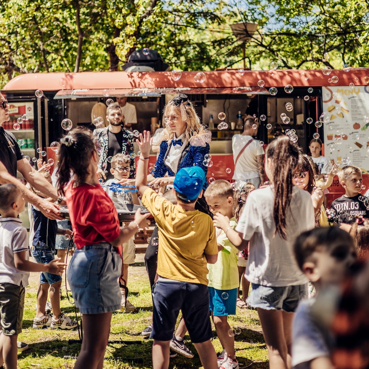 Освен спокойствието, там ще откриете един истински детски свят пълен с атракции, голяма зелена площ за игра, детска площадка с качествени и разнообразни съоръжения, както и голям Food Truck, на който се предлагат бургери, кесадии и други вкусотии за презареждане след безкрайната игра.